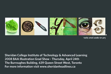 In addition to the grad show, a one-of-a-kind book was produced that showcases all students from the 2008 grad class. The book is currently being sold in limited bookstores throughout Toronto. Send me an email to get the list of stores where you can purchase the book and support Sheridan graduates.