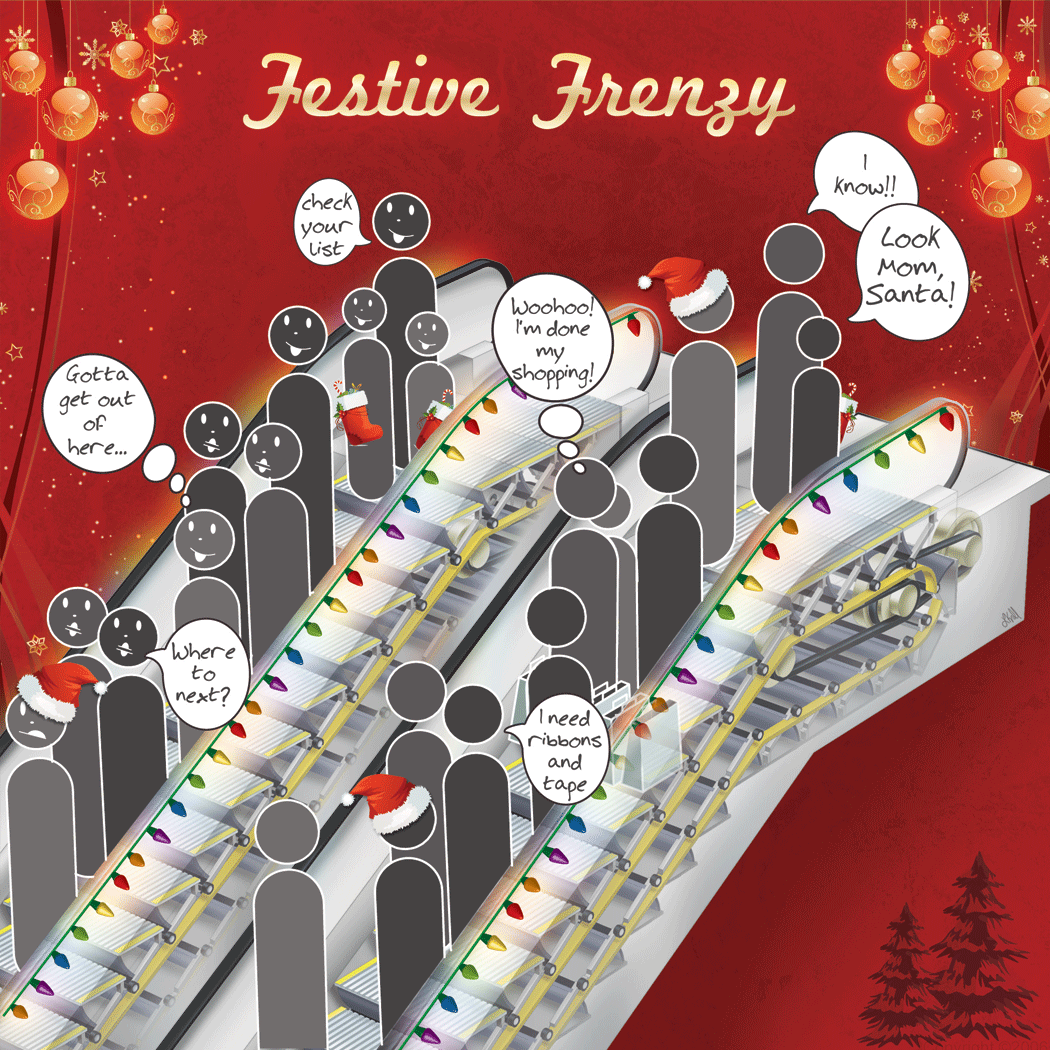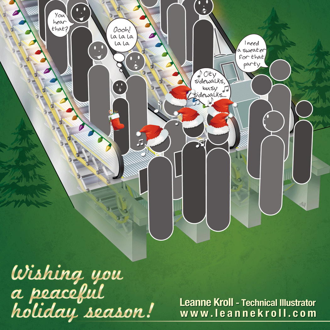 Designed as both a Christmas card and promotional holiday postcard, the scene reflects both the top and bottom of an escalator.