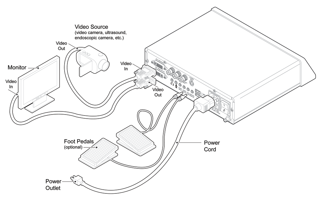 This assembly illustration shows the typical connections of the MediCapture device, allowing the user to easily see where to plug the typical cords into the medical video recorder.