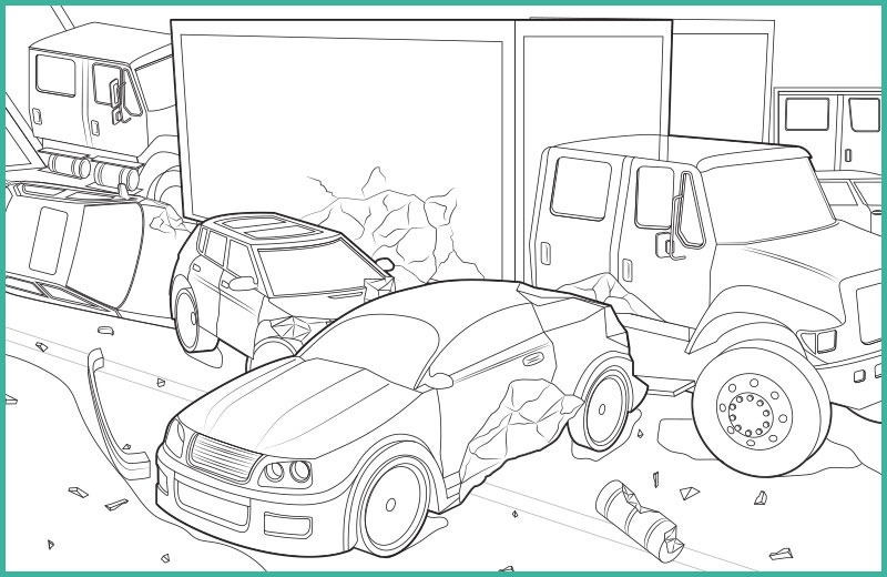 Initially all the drawings went through a basic first phase, where vehicles were simple shapes to allow the client to approve the placement and orientation of the vehicles in an accident scene. Once those initial illustrations were approved, the line drawing progressed to show specific items such as vehicle damage, debris on the road and skid marks.
