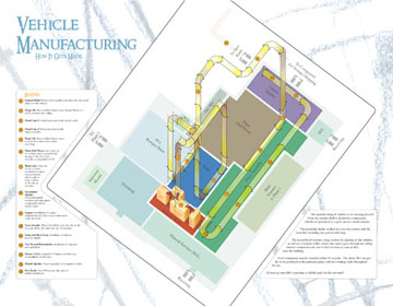 First, I begin with the manufacturing process. I had limited reference for this portion of the thesis due to “trade secrets” in the automotive industry. Firstly, I completed a one-on-one tour of the Honda plant in Alliston, Ontario where I was able to ask as many questions as I could possibly come up with about the daily functions of the plant. During the tour I was able to quickly sketch as we walked and to put my thoughts together into a map which informs the viewer of the flow of manufacturing vehicles.