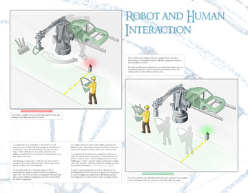 The second part of the manufacturing process in my thesis became more of a safety information graphic in the relationship between robot and human workers. Based on what I learned from the Honda Plant, I was able to prepare an illustration that reflected a time-delayed process where the robots and humans worked together. A component of metal was placed by the human on a stand which the arc welding robot would then pick up and weld onto the main frame of the vehicle.