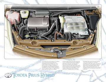 Another aspect of the alternative fuels thesis which I chose to illustrate where components of various vehicles. Thanks to Gerry Malloy, Automotive Journalist with the Toronto Star, I was able to gain numerous research photos of the Toyota Prius Hybrid Synergy vehicle. I chose to fully illustrate the vehicle components under the hood, with a phantom view of the Hybrid Synergy Drive.