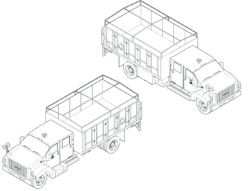 The first, is a conventional vehicle with a stake and rack style bed where the stakes can be removed from the vehicle and the truck body also becomes a flat bed to carry loads. This vehicle is shown with a crew cab.