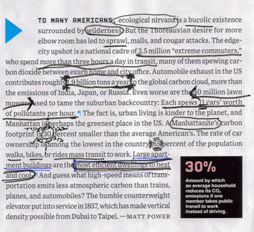 I was inspired a couple of months ago by an article I read in Wired Magazine. The article debated the opposing side of environmental issues which have begun to consume society lately. In it, there are 10 points which are debated and they all contained some type of statistical information. There were no illustrations accompanying this article.