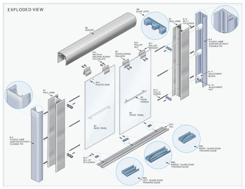The exploded view of the shower door is done as an isometric illustration with callouts to specific items to show further details for the consumer piecing it together.