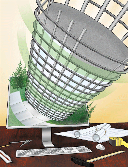 This illustration pushes the idea of a 3-dimensional building extending out of the computer monitor. As a representation of building information modelling, it illustrates – “from the computer to reality!”