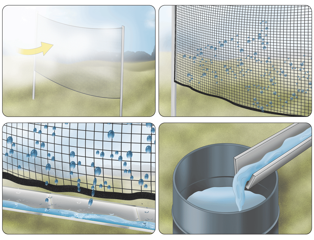 In Peru, scientists designed a concept to gather the fog and use it to produce water for the villagers. They built special nets through which the fog would travel and capture tiny water droplets that would combine and drip into a gutter. The water was then designed to flow through pipes into tanks. What an amazing design solution!