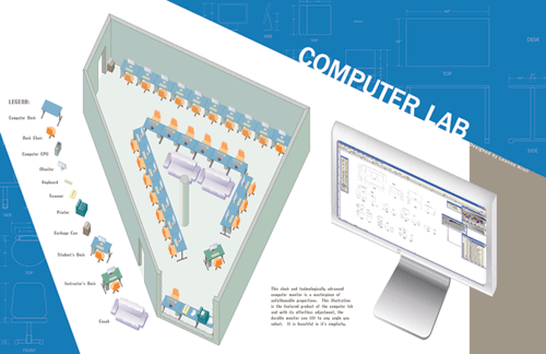In the above classroom illustration each desk and workstation is exactly the same in scale, unlike a perspective illustration which would have give the illusion of 3-dimensional space.